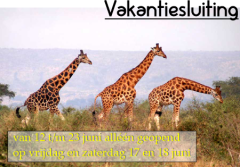 Van zondag 12 juni t/m donderdag 23 juni zijn we wegens vakantie alleen geopend op vrijdag 17 en zaterdag 18 juni.